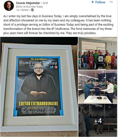 सौरव मजूमदार ने लिंक्डइन पर अपनी भावनाएं व्यक्त करते हुए कहा कि बिजनेस टुडे में अपने आखिरी दिनों में वह टीम और सहकर्मियों द्वारा मिले प्यार और सम्मान से अभिभूत हैं। उन्होंने कहा कि बिजनेस टुडे के संपादक के रूप में काम करना और ब्रांड को BT मल्टीवर्स में बदलने की रोमांचक यात्रा का हिस्सा बनना उनके लिए एक सौभाग्य की बात रही है। यहां बिताए गए तीन से अधिक वर्षों की यादें हमेशा उनके दिल में रहेंगी और उनके लिए यह अनमोल हैं।